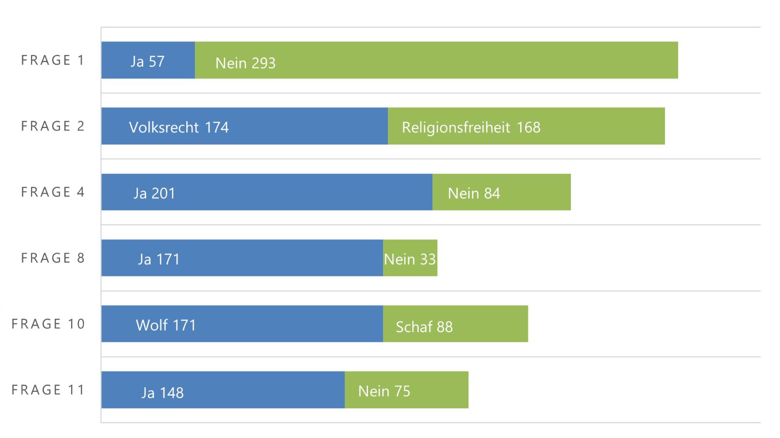 Bei den Stationen mit offenen Fragen können Sie die Antwortzettel zum Lesen aus der Abstimmungsbox herausnehmen. Die Auswertung der Entweder-oder-Fragen finden Sie hier: